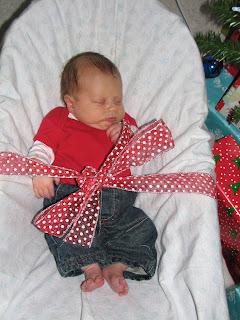 After the kids were in bed, the adults stayed up to visit for a bit. Everyone could tell that I was exhausted (the crying might have given it away) and Jay and my sisters took this opportunity to gang up on me. Paxton had hit his 3 week growth spurt so he was eating a lot more, and I couldn't quite keep up with production. They all informed me that I should start supplementing him with formula so that he would be full which would in turn allow me to sleep. And Auntie Kizzy volunteered to take Paxton for the night so I could get some uninterrupted sleep. I finally agreed and headed off to bed with Jay. That was by far the best present I got because I got 7 hours of sleep! I was really refreshed the next morning, but I was in so much pain when I woke up around 6 because I hadn't pumped for so long! I remedied that right away and then everyone started getting up for the day. After breakfast we headed to the living room and Rhett got to hand out the presents as Grandpa's "Elf". We all got spoiled (as usual) and then visited and got ready for dinner. After dinner and more visiting, Kelly's family headed out to Taber to spend Christmas Day with Cliff's family and Jay, Paxton and I headed back home to Lethbridge.